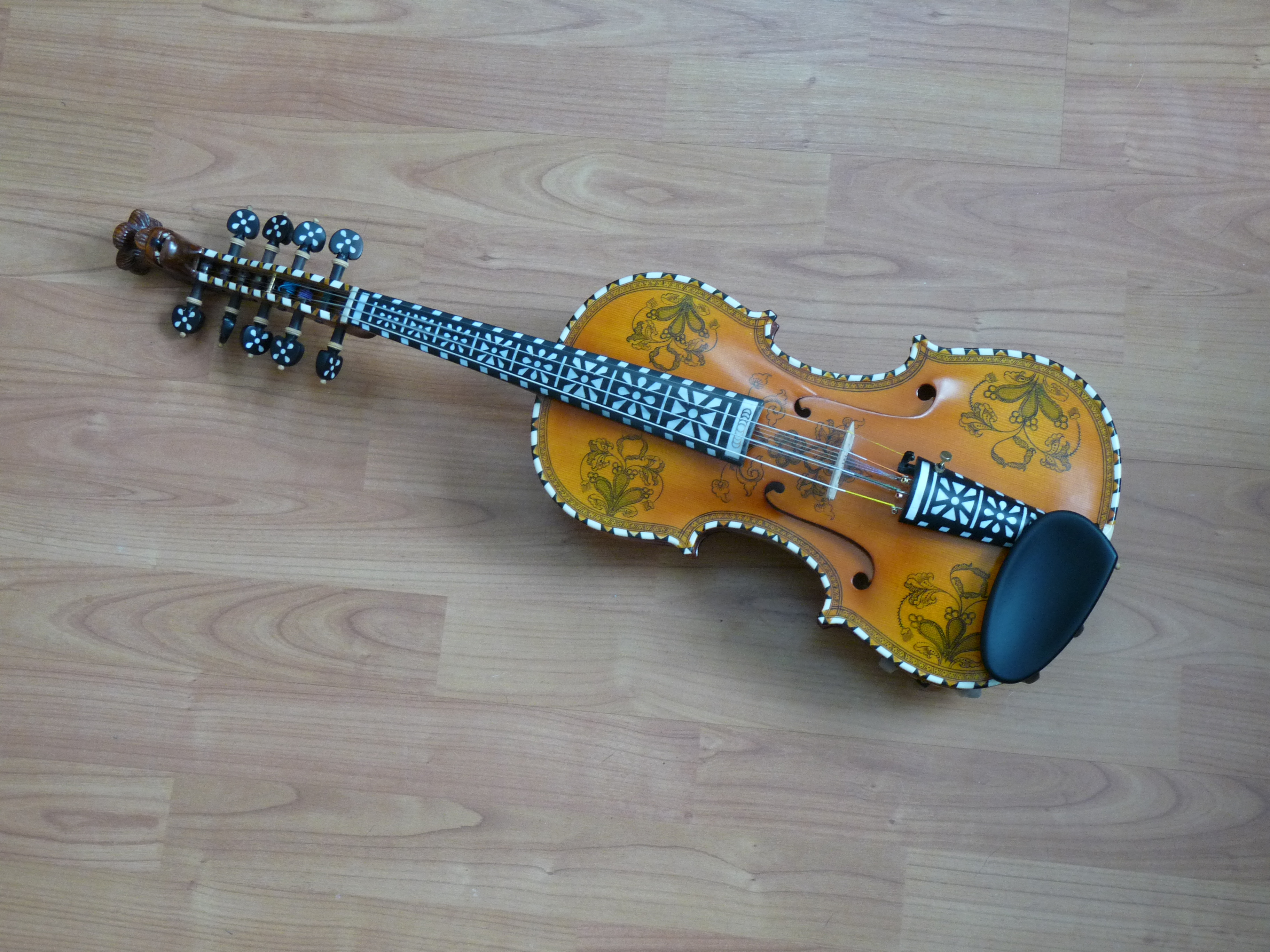 Fyra spelsträngar (längst till höger som på en fiol) och fem resonanssträngar kräver en betydligt längre hals för att man skall få plats med stämskruvar för nio strängar. Den vanliga snäckan på en fiol är ersatt med ett lejonhuvud.