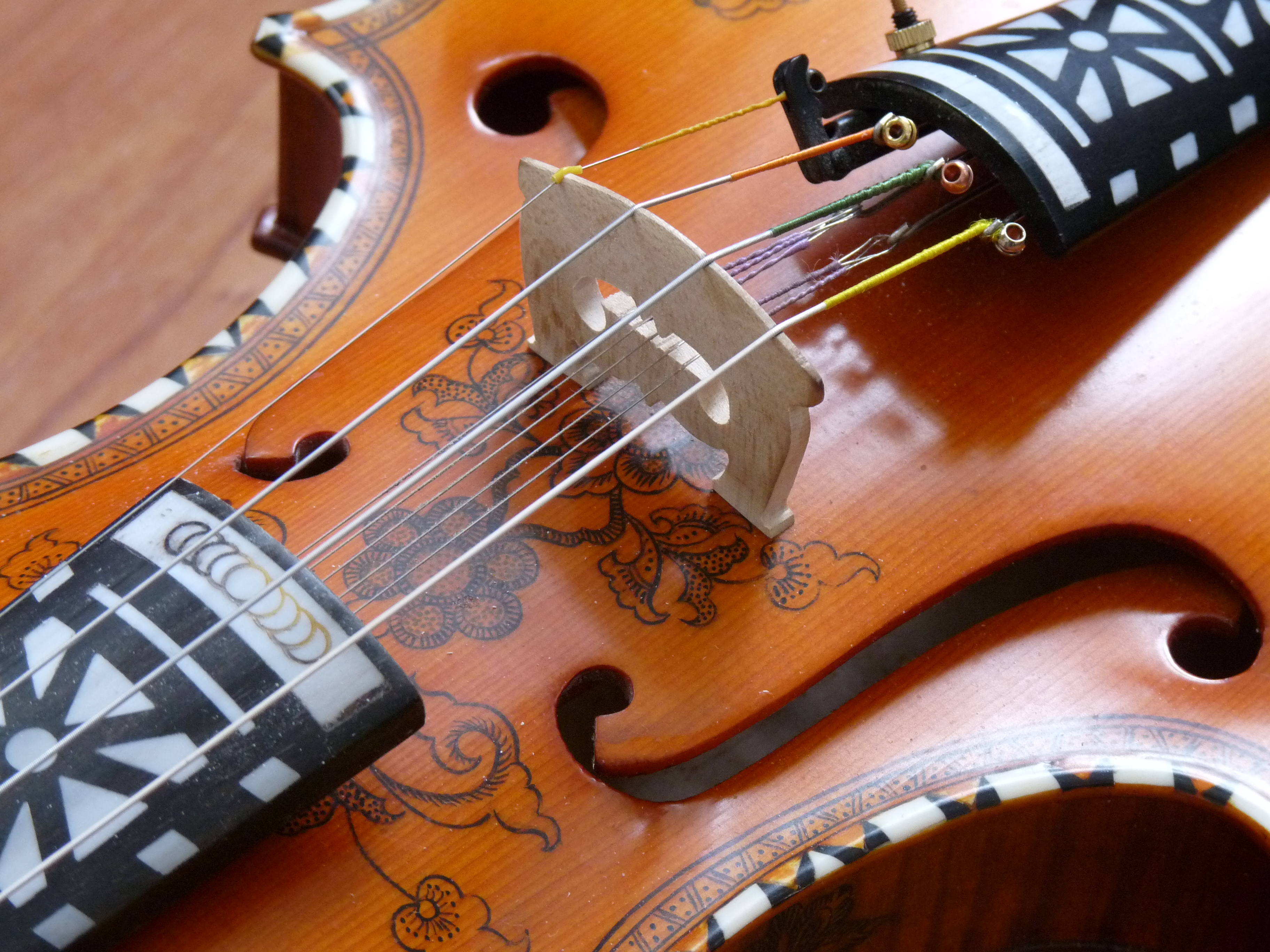 Detalj av stallet på en hardangerfiol. Observera resonanssträngarna som löper genom stallet.