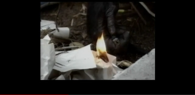 Fig. 2 Apan Konzi plockar ihop trä för en lägereld och tänder själv elden, dock med tändare.