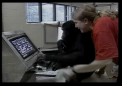 Fig. 6 En Bonoboapa som inte har problem med att spela ett videospel och som förstår att man skall försöka undvika spöken som jagar den egna figuren.