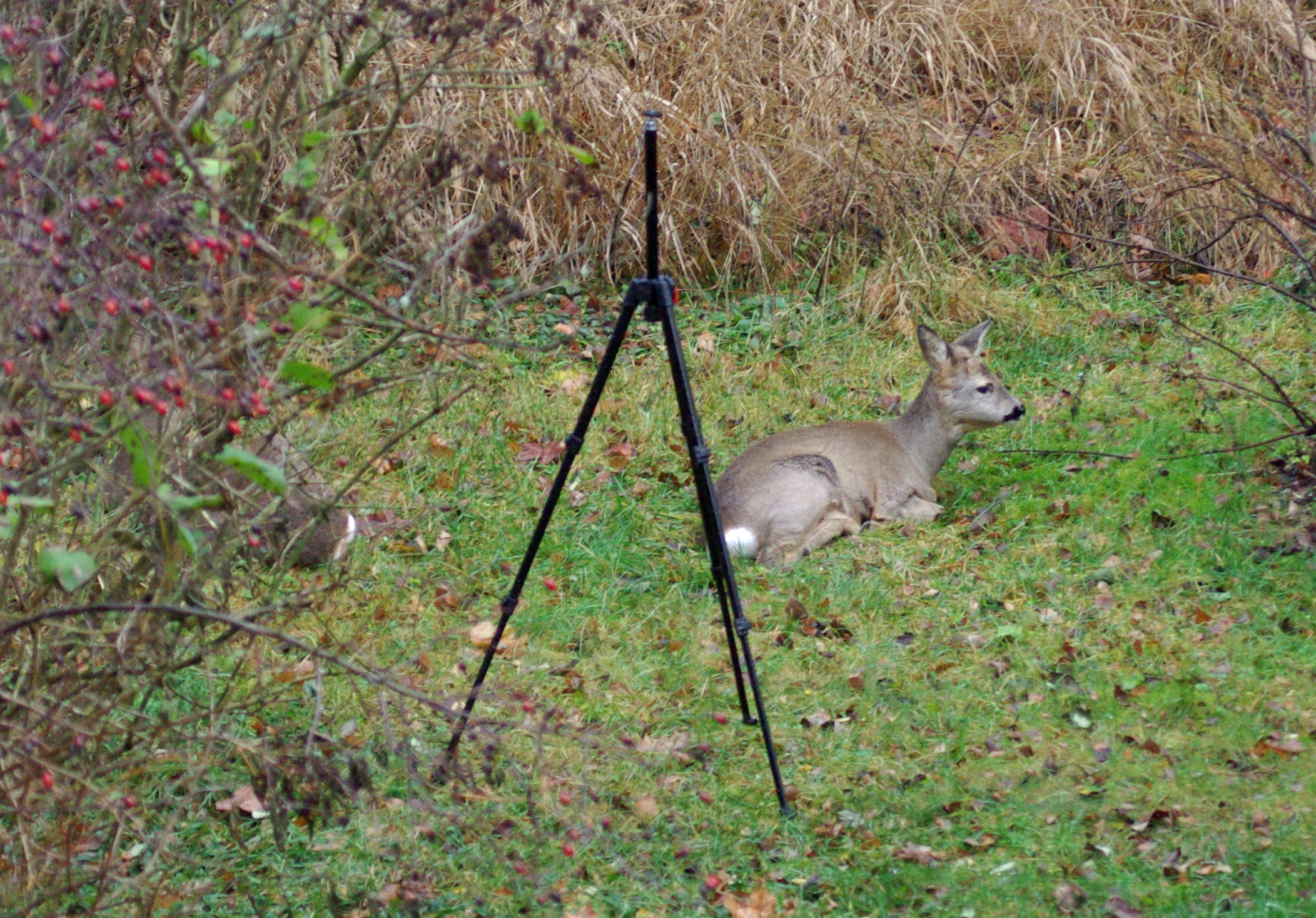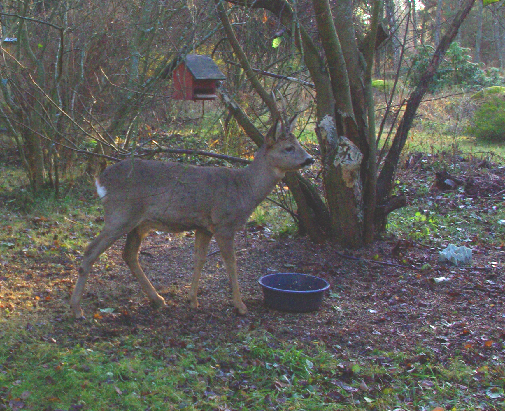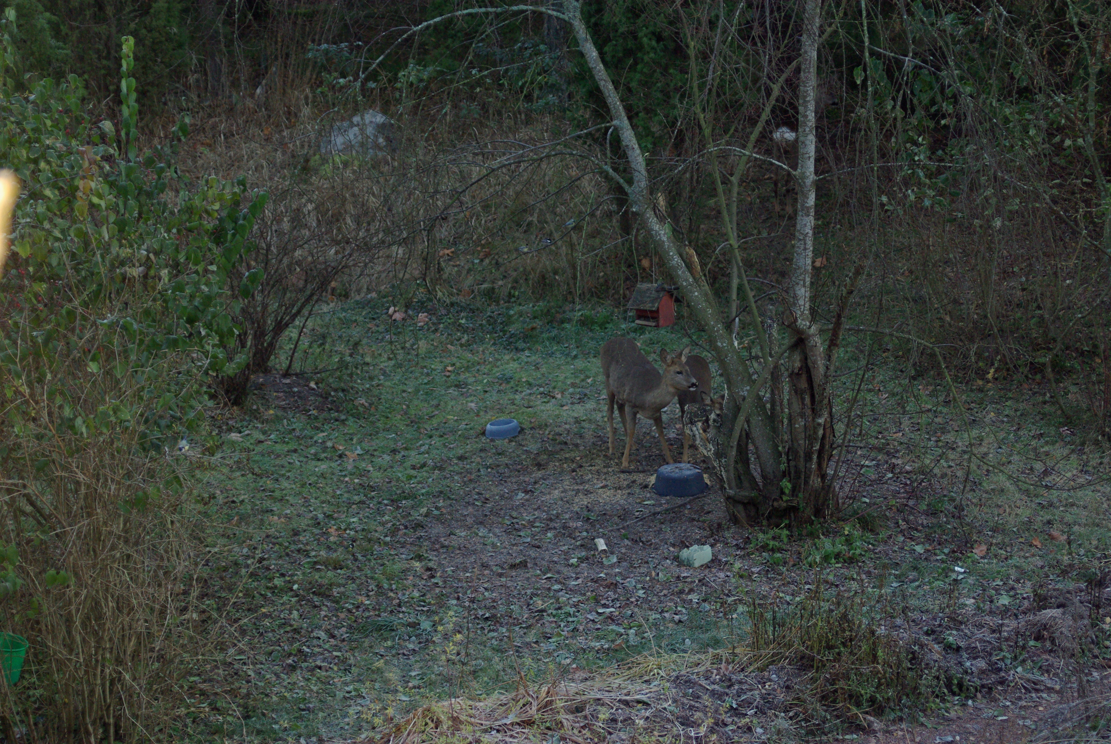 Jag lät kamerastativet stå ute på gården så att djuren skulle vänja sig. Stativet står på den plats från vilken jag tog bildserien av blåmesen. Efter några dagar vande sig rådjuren och brydde sig inte om den konstiga trebeningen längre. Det verkade inte vara så viktigt om det fanns en kamera på stativet eller inte.