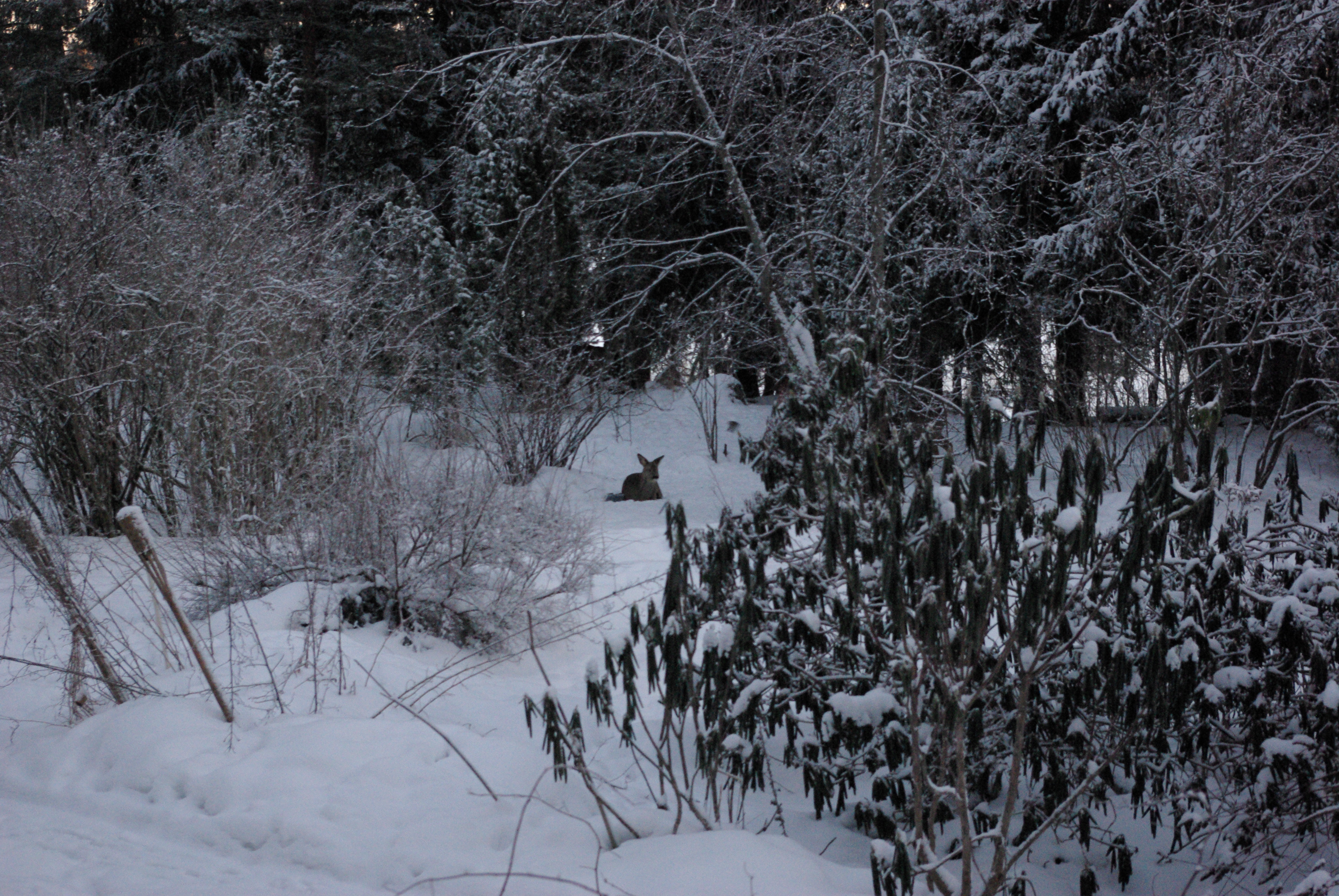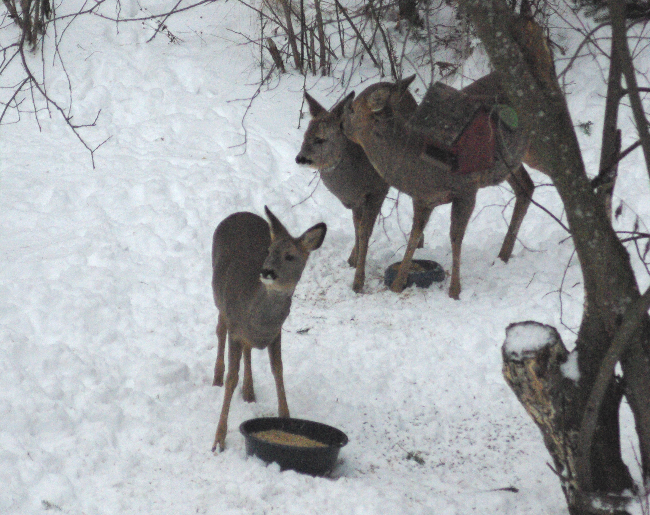 Vintern 2012-2013 var mycket snörik. Den 24.1.2013 såg det ut så här. Rådjuren flyttar sig inte i onödan utan det är tydligen bekvämt att ligga kanske tio meter från matskålarna.