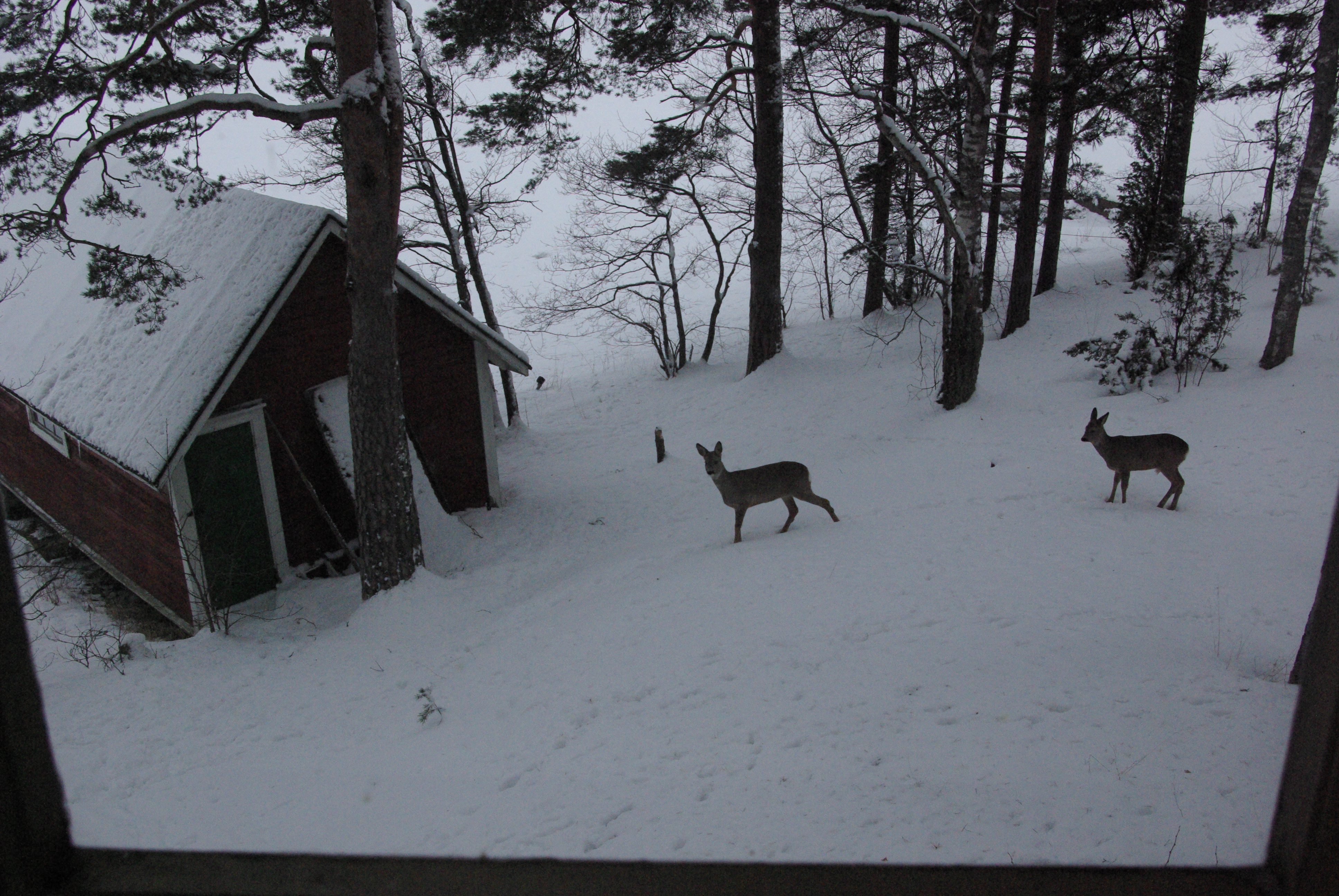Vintern är och har varit kallare än på många år. Två rådjur sedda genom verandafönstret. Avståndet är kanske tjugo meter.