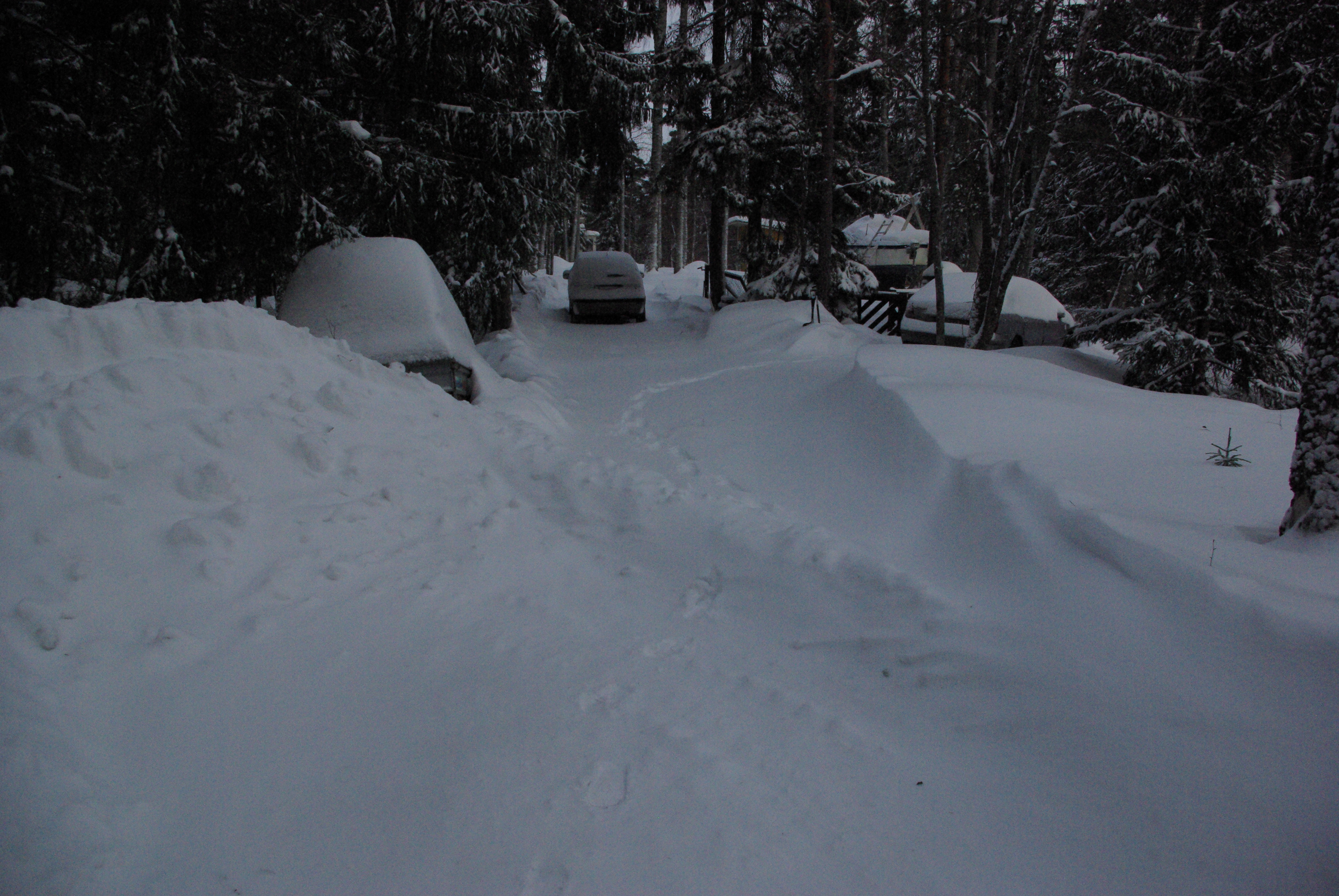 Det är den tredje mars och det kommer fortfarande mera snö. Snart borde det ju börja smälta, men det finns inga tecken på det ännu. Tidvis har det varit besvärligt att komma ut med bilarna.