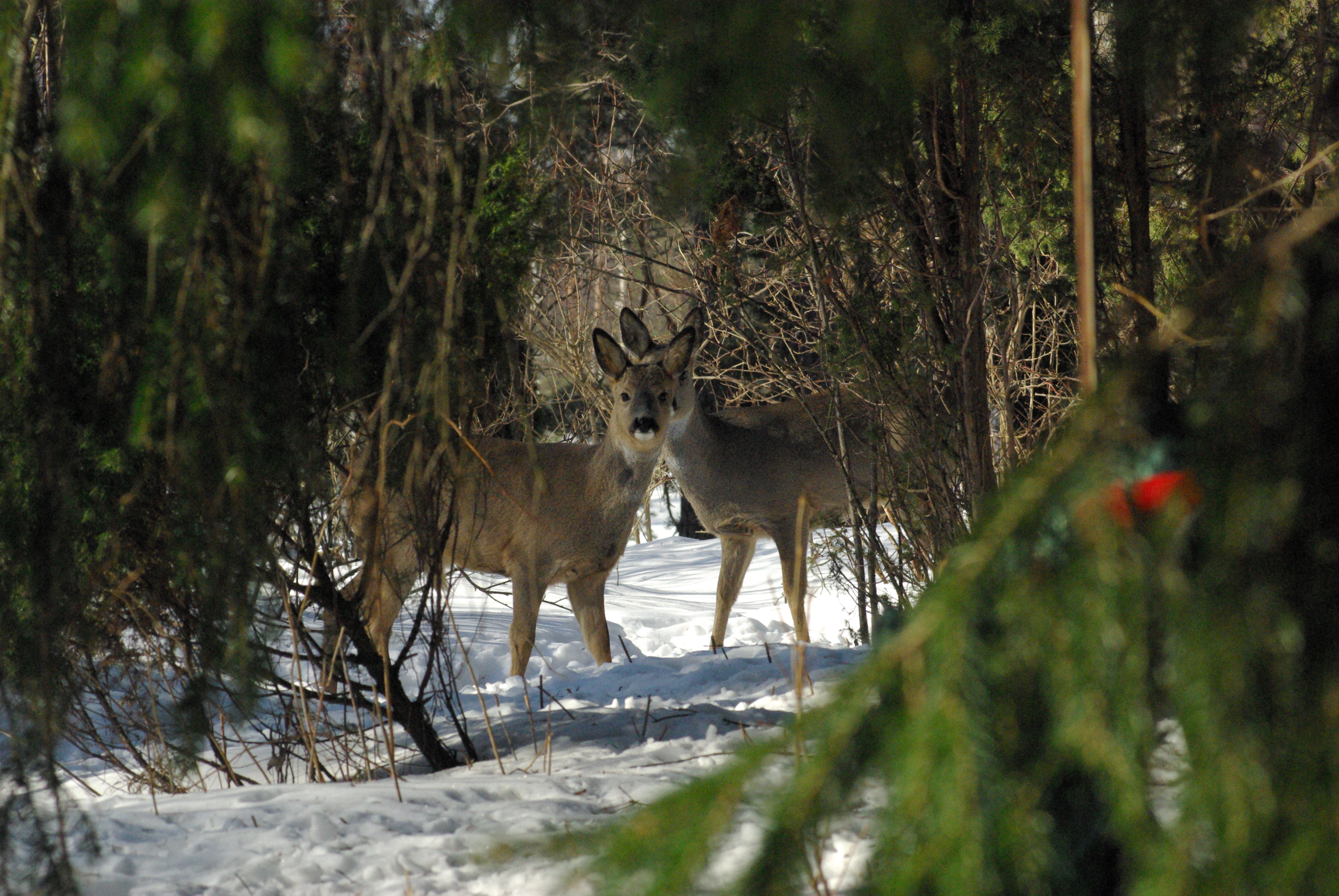 Vad gör du där? Två rådjur fotograferade med 200 mm teleobjektiv från snickarboden. Rådjuren ser förvånade ut eftersom den kalla snickarboden endast sporadiskt besöks under vintern.