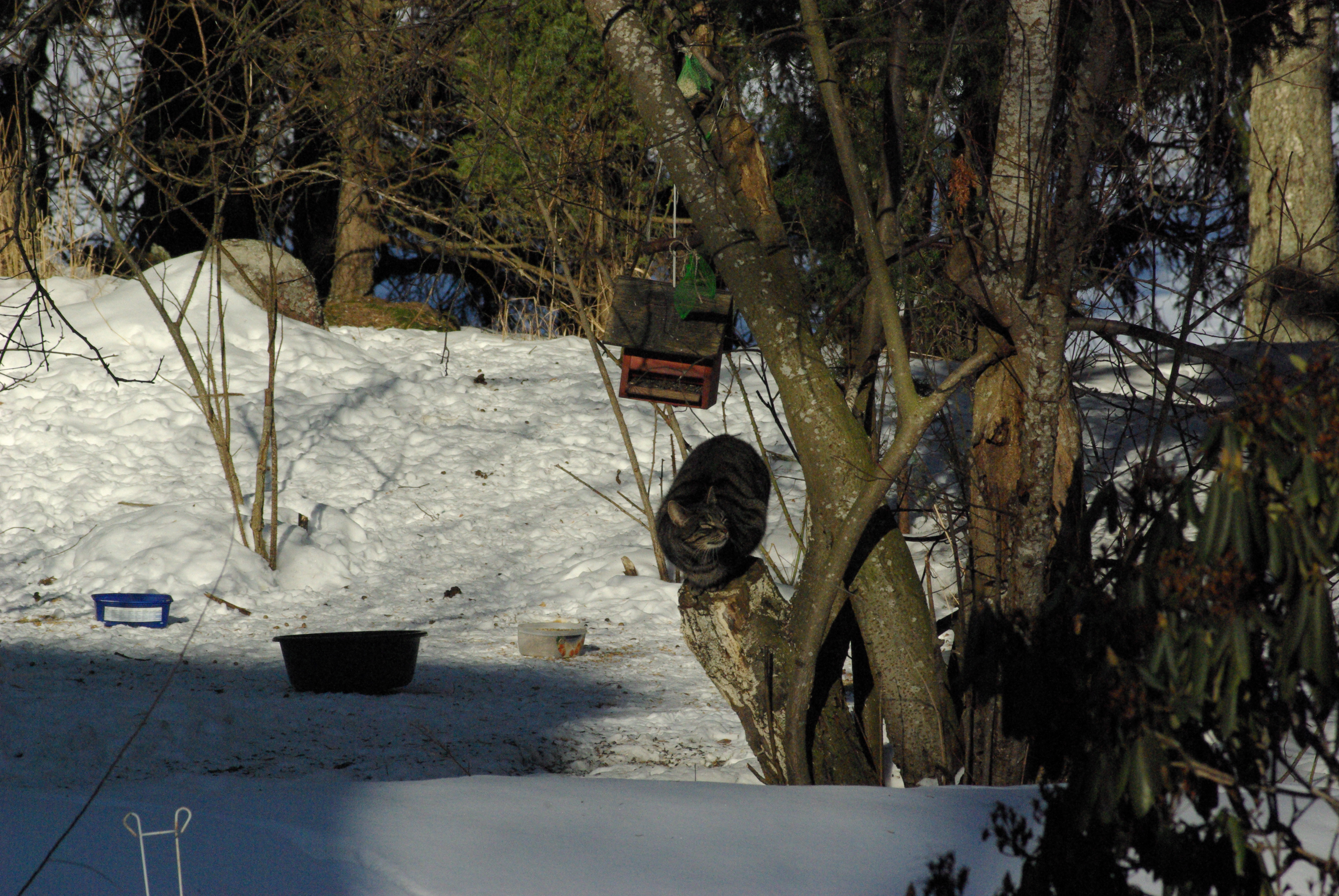 Katten Herkules är slug och har valt den perfekta jaktplatsen. Lyckligtvis verkar fåglarna vara uppmärksamma. Det är faktiskt förvånande sällan vi ser fågelfjädrar eller fågellik. Katten är dock alltid lika optimistisk. Herkules är en mycket effektiv sorkjägare.