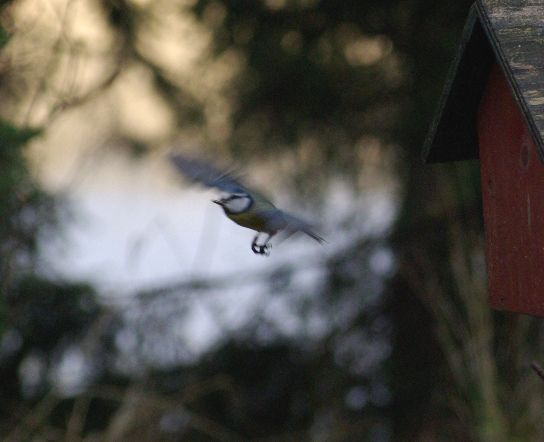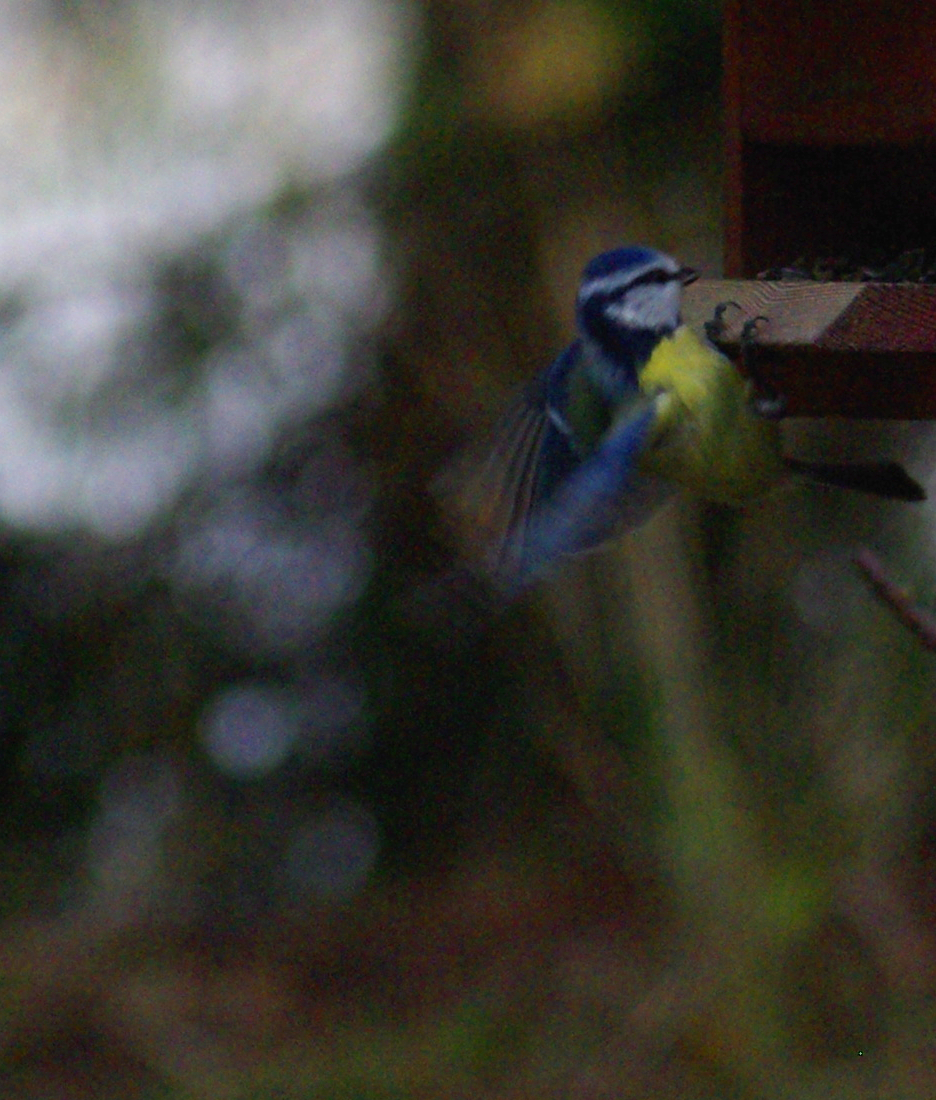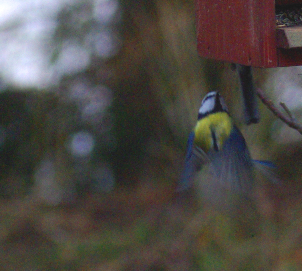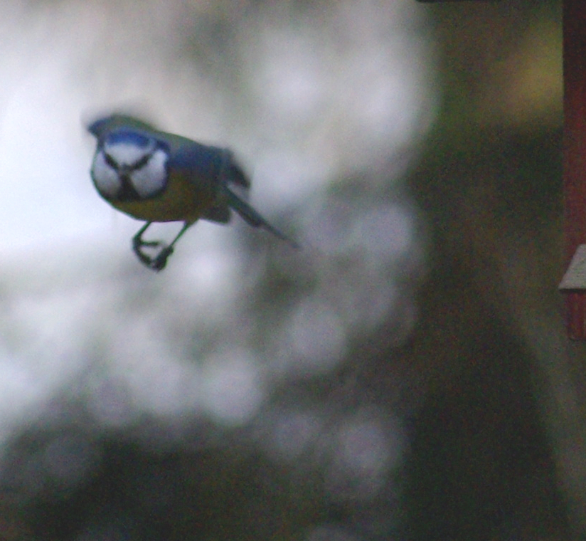 Jag experimenterade med fjärrutlösning av kameran under flera dagars tid. Det var roligt att försöka få bilder av fåglarna som nu i större mängder började besöka fågelbordet. Tekniken var helt enkelt att ta en stor mängd bilder och hoppas att någon skulle bli bra. Resultatet den 12.11.2012 blev en blåmes som landar.