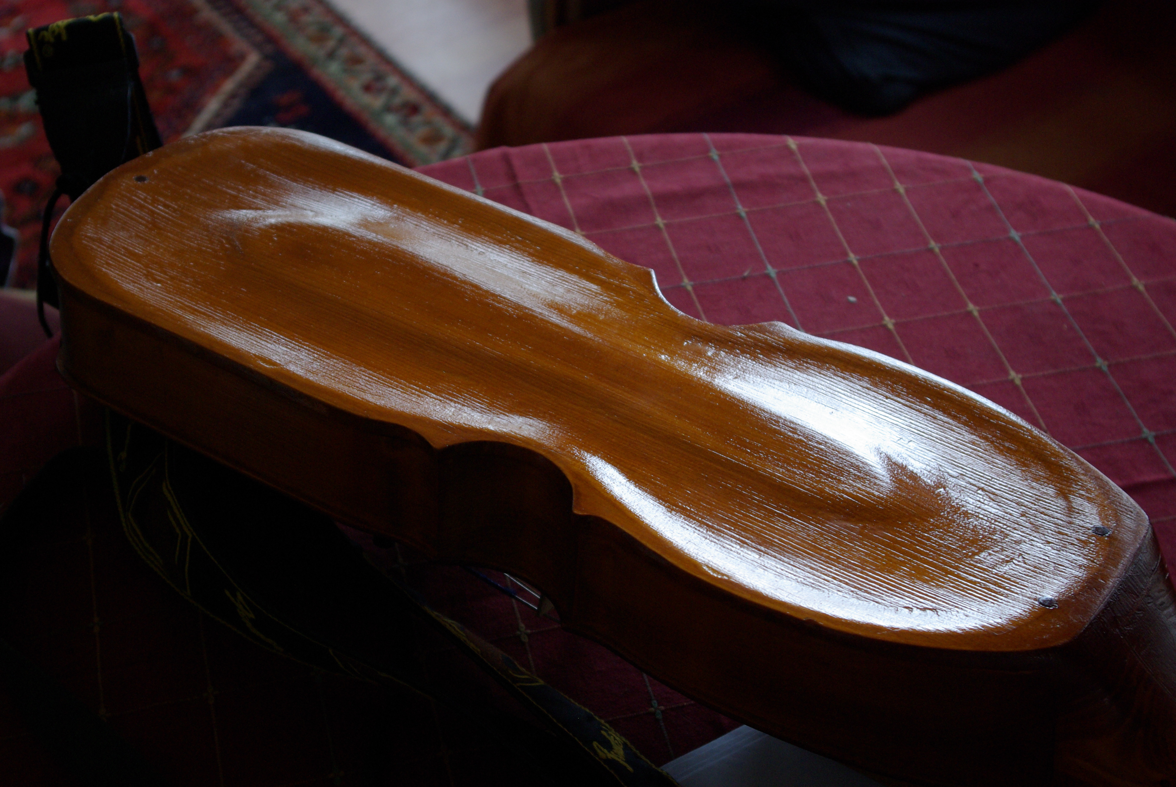 Ett exempel på mitt eget experimenterande med att stämma bottenplattan. Kopiera inte formen utan lyssna medan botten gröps ur. Akustiskt kommer stämning av plattan att leda till en form som påminner om formen på violinens bottenplatta.