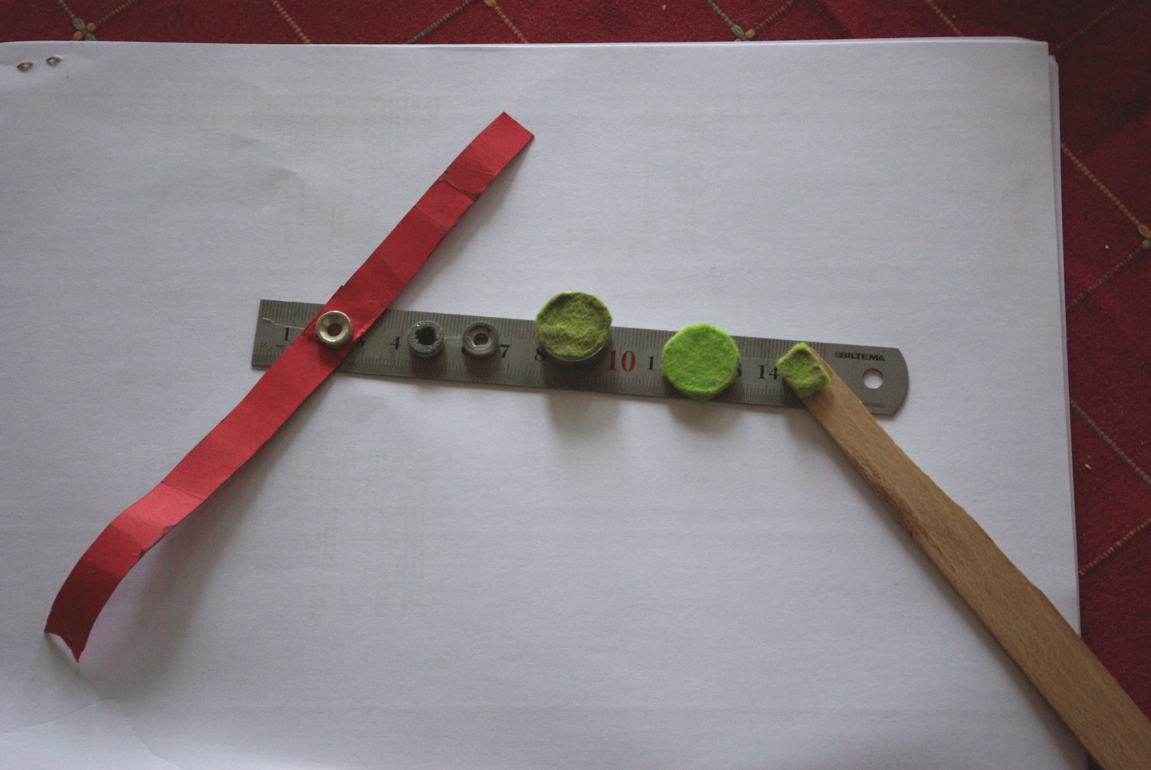 Den röda pappersremsan med en liten magnet pålimmad används till att slipa området mellan halsen och basbjälkens ända. De två följande små magneterna har olika grovlekars slipmaterial P40 och P80. Observera att det är helt möjligt att limma olika grovlekars slipmaterial på olika sidor av slipmagneten. Slipmagneten kan vändas genom att helt enkelt vända den yttre magneten (det lönar sig då att limma på filt i olika färger för att ha kontroll över vilken slipsida som används). De följande tre magneterna har pålimmad filt för att inte repa lacket eftersom de används på utsidan av instrumentet. Magneten som limmats på en träpinne används rätt mycket för att komma åt besvärliga ställen t.ex. under stallet. Den slitna missfärgade stora magneten är ca. 20 mm i diameter och ca. 10 mm tjock. Den magnetiska kraften är mycket stor och magneten är lätt att greppa, det här är den magnet jag använder mest tillsammans med de två små slipmagneterna.