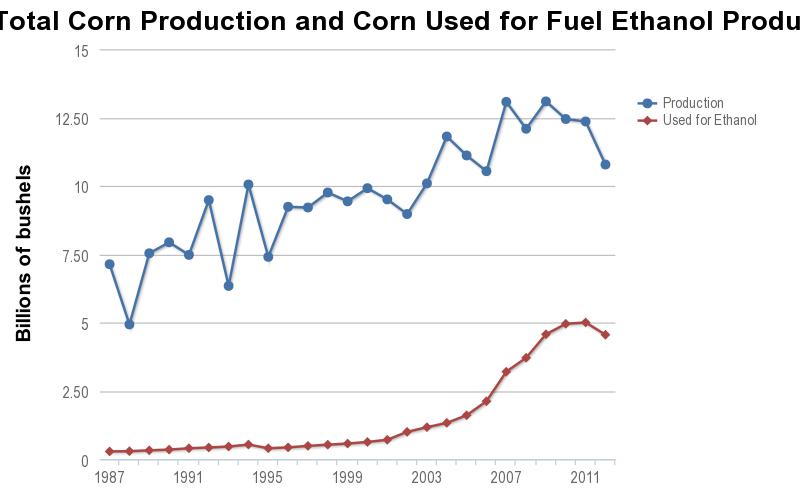 Bilden visar hur en allt större del av majsproduktionen i USA (30 – 40%) har använts till att producera motorbränsle i form av etanol. Källa http://www.afdc.energy.gov/data/tab/fuels-infrastructure .