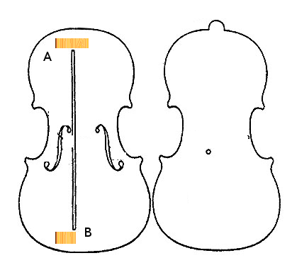 Fig. 1 Området vid A påverkar kraftigt hur lockets grundsvängningsmod kring basbjälken kommer igång. Genom att slipa området under A på insidan av fiolen mörknar tonen. Det är skäl att slipa mycket försiktigt. T.o.m. 5 – 10 drag hörs tydligt. Börja med att slipa endast några drag mellan provspelningarna. Om ingen effekt hörs ökar du successivt antalet slipdrag. Observera att det är mycket lätt gjort att genom att slipa här få tonen alltför mörk.