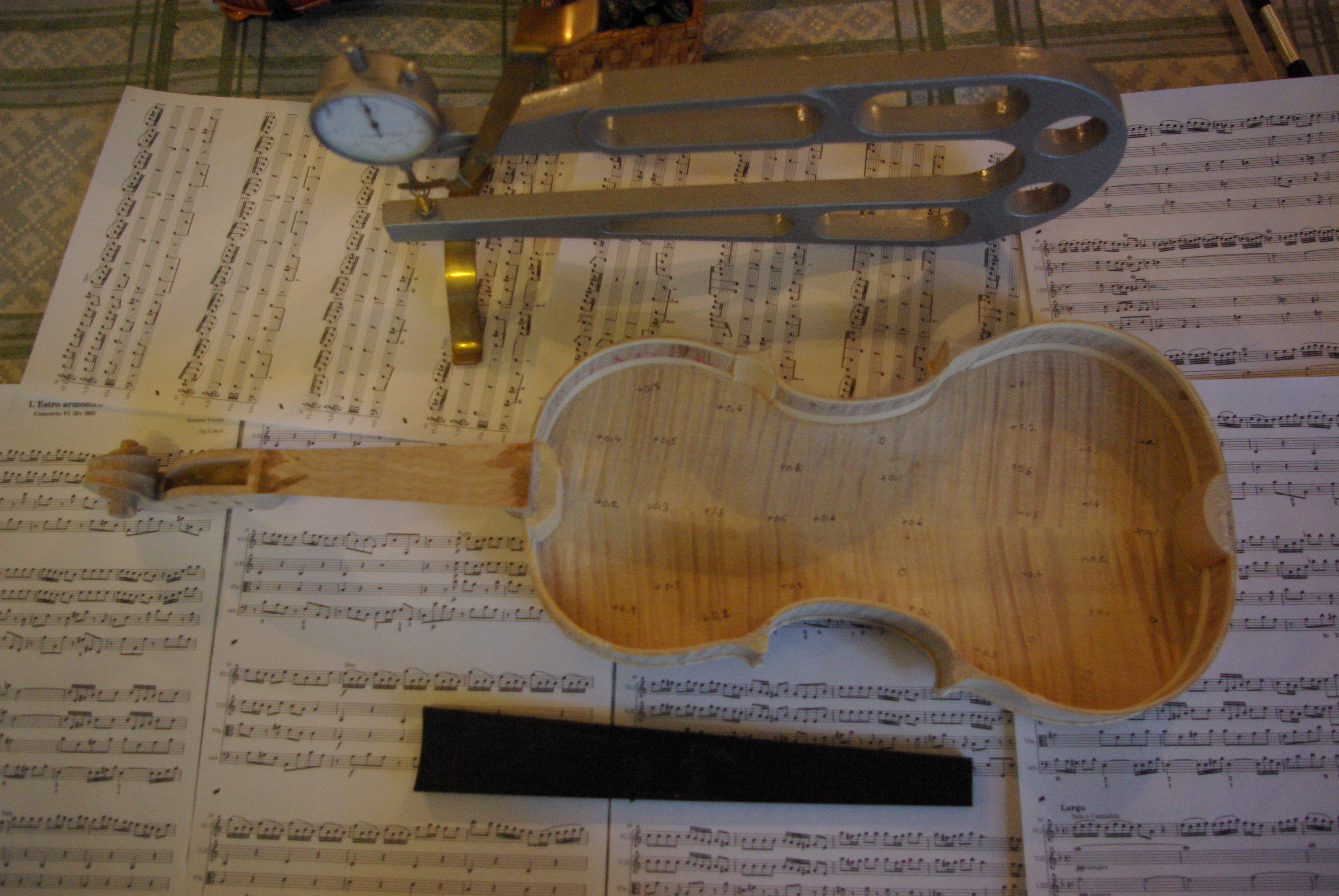 Man ser tydligt att greppbrädan har varit mycket svagt pålimmad (detta är bra!) för att den lätt skall kunna tas loss. Med hjälp av mikrometerklocka jämförde jag tjockleken på bottenplattan med förlagan Tibor Vargas del Gesu från 1733. Det allmänna intrycket är att bottenplattan som väntat generellt är ca. 0,5 mm för tjock dock inte överallt. Du kan se tjockleksmarkeringarna d.v.s. hur mycket för tjockt locket är i olika punkter genom att klicka på bilden.