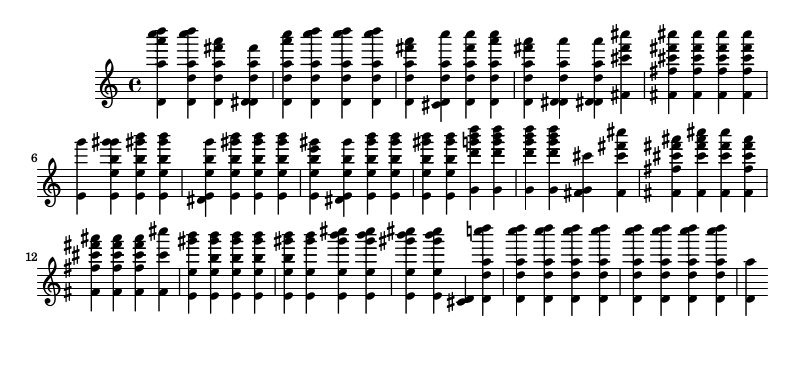 För att generera noter behöver vi nu endast plocka ut notvärdena ur tabellen och skriva ut noterna (de harmoniska övertonerna) som ett ackord i LilyPond.