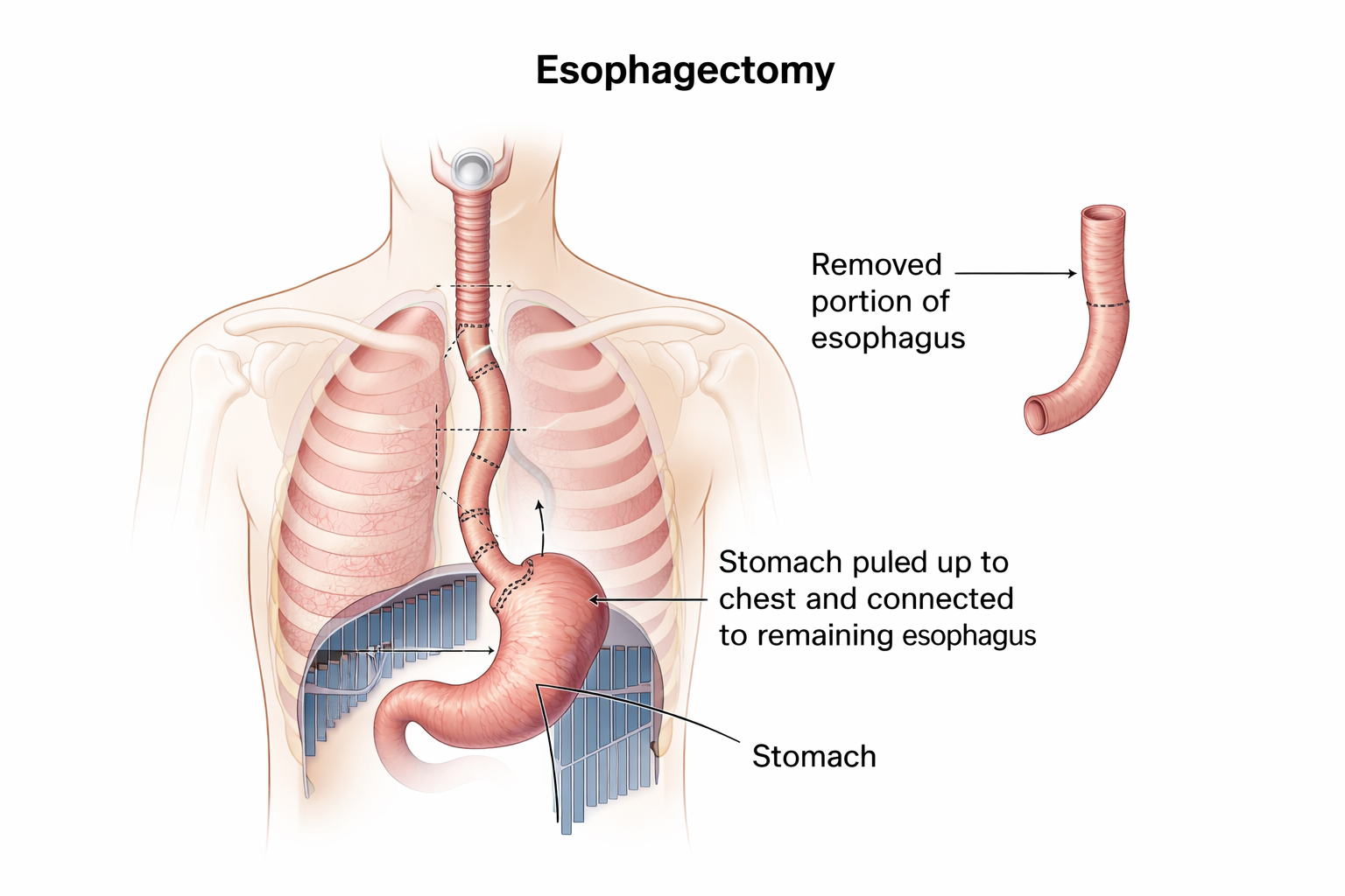 Bilden (genererad av ChatGPT) visar den operation jag främst försöker undvika d.v.s. det som kallas Esophagectomy. Det berörda området av matstrupen skärs bort inklusive ventilen ner till magsäcken som håller magsafterna borta från matstrupen. Av magsäcken skärs betydligt mer än vad bilden visas bort så att man skapar ett rör som sys fast i det som finns kvar av matstrupen. Resultatet blir stor risk för halsbränna då ventilen saknas kombinerat med en förstörd matsäck vilket påverkar matsmältningen och tvingar patienten att äta mycket små mål och ofta med illamående och olika typer av tarmproblem. Halsbränna kräver sannolikt behandling livet ut ofta med protonpumpshämmare som vid långvarig användning kan ge hjärtproblem, skador på njurarna, brist på t.ex. B12-vitamin då matsmältningen påverkas samt Alzheimer. Bieffekten av operationen kan vara att patienten långsamt tynar bort.