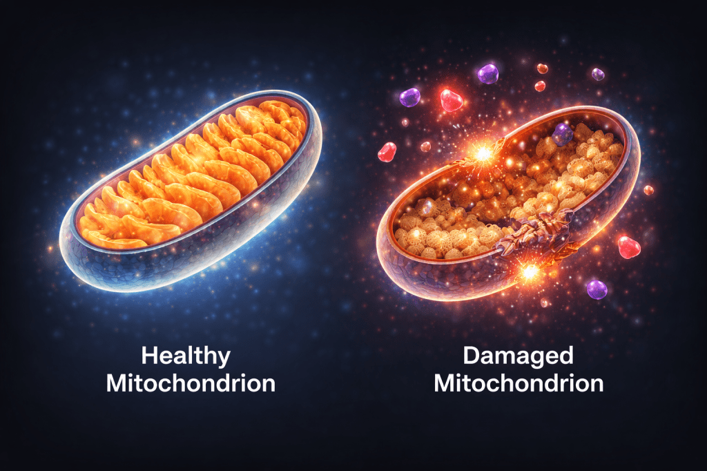 Bilden visar schematiskt hur innanmätet i mitokondrierna bryts ner i en cancercell. Bilden är genererad av ChatGPT och inte in bild av verkliga mitokondrier. Mitokondrierna är intressanta eftersom det verkar vara troligt att de ursprungligen var bakterier som nu lever i symbios med de mänskliga cellerna. Mitokondrierna har bl.a. ett eget helt oberoende DNA som ärvs på moderlinjen d.v.s. den cellkombination som ger en befruktad cell som utvecklas till ett embryo får sina mitokondrier från moderns ägg inte från spermien.