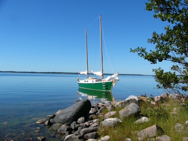 Fig. 2 Ligger för ankars i Torasviken. Reservankaret används. Eftersom reservankaret inte är speciellt bra ligger jag mot vasskanten. En vigg är så grundgående att det i allmänhet går att ankra precis vid vasskanten. Vassen gör att båten inte svänger av och an vilket gör att draggen får bättre grepp.
