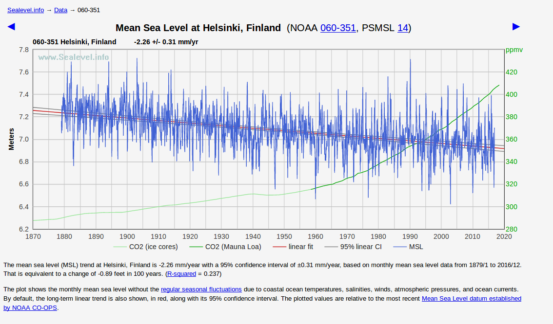 Bilden visar havsytans nivå i Helsingfors sedan 1880-talet (Källa: NOAA). Vi ser betydande årsvariationer (bruset d.v.s. bredden på den blåa kurvan) som beror av vindriktningar och hur lågtryck råkar gå över området. Kraftiga sydvästliga/västliga vindar kan pressa vatten i östersjöbassängen österut vilket ger högvatten i Finska viken. Effekten är kraftigast längst inne i Finska viken i trakten av St Petersburg där man har byggt skyddssystem just för denna situation. Denna typ av högvatten är inte kopplade till luftens CO2 halt. Den andra mekanismen för att höja havsytan lokalt är lufttrycket. En atmosfär motsvarar en vattenpelare med höjden tio meter. Ett längre stationärt högtryck kan sänka havsytan med 30-40 cm och på motsvarande sätt kan ett lågtryck som blir hängande över området höja vattennivån i ingefär motsvarande grad. En tredje mekanism i ett innanhav med ett smalt utlopp till världshaven är naturligtvis nederbörd. Spridningen i bilden ovan d.v.s. bredden på det mätta bandet är ungefär +/- 0,45 m och denna spridning beror sannolikt i huvudsak på variationer i lufttrycket.