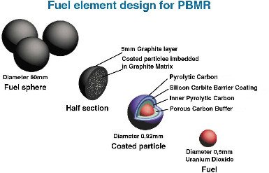 Kärnbränslet är hermetiskt inneslutet i ett kraftigt skal av bl.a. kol och kiselkarbid som tål temperaturer upp till ca. 2000 oC. Bränslet upparbetas inte utan slutförvaras som sådant. Fig. 1 visar bränsleelementens konstruktion.