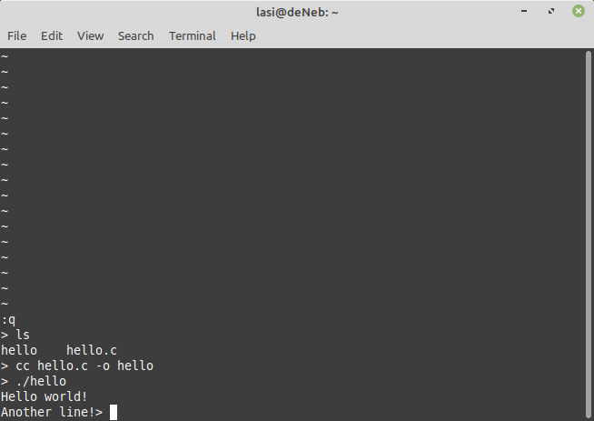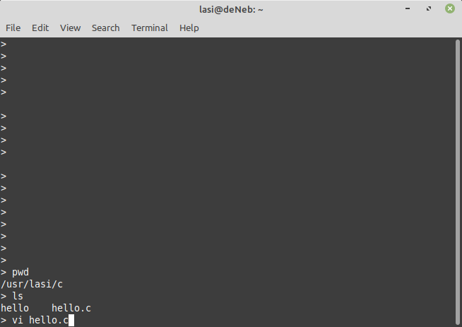 På PDP11 har jag endast två filer i min arbetskatalog d.v.s. ett ”Hello world!” c-program och samma program i kompilerad körbar form.