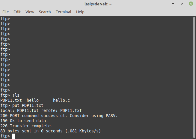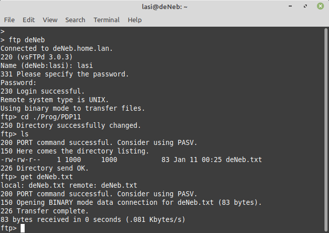 Jag flyttar filen PDP11.txt till deNeb med ftpkommandot put PDP11.txt . Jag kan nu i ett annat terminalfönster kontrollera att filen faktiskt levererades korrekt.