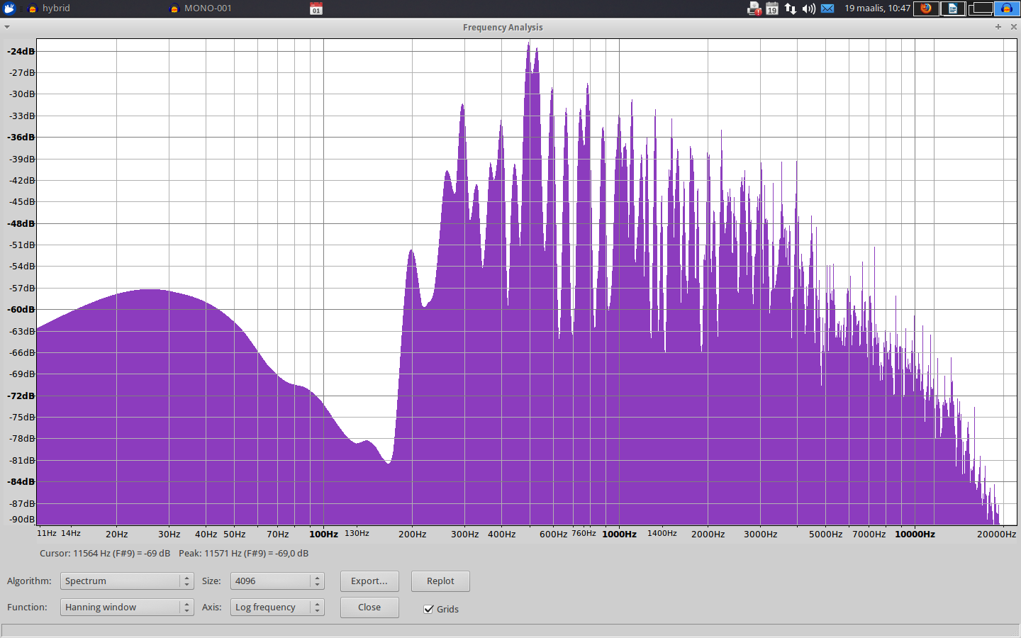 Knackmätningen av stallet gjordes så att kanske 2 mm av stallsfötterna drogs fast i ett skruvstäd. Mikrofonen var en stormembransmikrofon av typen t-bone USB SC-440. Mikrofonenens avstånd till stallets platta baksida var ungefär 5 cm. Jag använde en svetselektrod av Volfram med diametern 2,3 mm som hammare och knackade tre gånger med kanske 2 sekunders intervall på örat ungefär i höjd med öronöppningens översta del. Bilden nedan består alltså av tre spektra som ligger på varandra därav de olika färgerna. Programmet söker själv fram de olika knackningarna och beräknar separata spektra för de olika knackningarna. Programmet tillåter mig att föra kursorn till resonanstoppen i mitten av bilden och avläsa motsvarande frekvens.