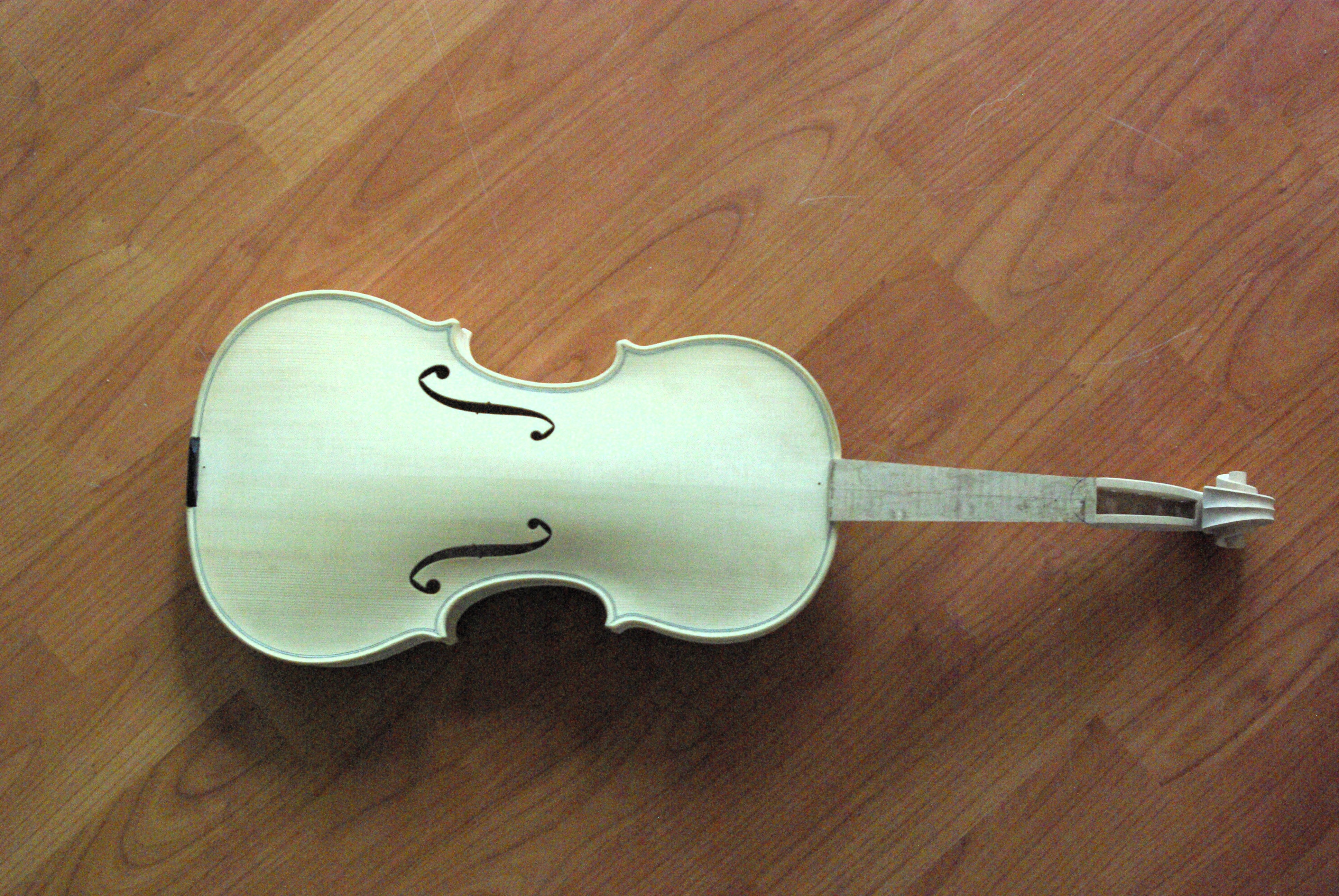 Fig. 1 En trävit, mycket välbyggd, fiol av Guarneri modell (1742 Lord Wilton) av Roy (Kang Fa Qi). Greppbrädan har avlägsnats för modifikationer och för att underlätta senare lackning av fiolen.