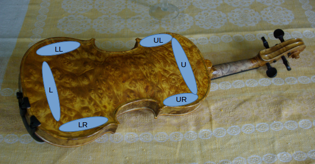 - I Hargraves gradueringsdiagram syns två värden 2.3 mm som är en tiondel tunnare än omgivande områden. Jag sicklade en ”linje” d.v.s. 10 – 15 mm område till ungefär 2.3 mm från mitten av den stora kroppsbågen på diskantsidan i riktning mot en punkt mitt emellan ljudpinnen och basbjälken. Erfarenheten visar igen att slipning av (insidan) detta område ofta ger tonförbättring eftersom en gränslinje mellan basbjälkens stora svängningsområde och det lilla området runt diskantsidans f-hål går precis där (se Schleskes mätningar av fiolers svängningsmoder). Hargraves gradueringsmätning kan tyda på att detta gjorts medvetet av Guarnerius men det går inte att dra några säkra slutsatser eftersom mätpunkterna är alltför få.