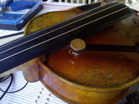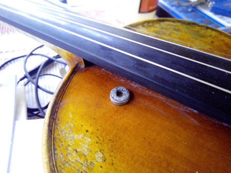 Fiolen strängades i detta skede temporärt, dock utan att kraftigt spänna strängarna, för att mäta korrekt längd på ljudpinnen på rätt plats. Strängarna får inte spännas utan ljudpinne eftersom locket kan ta skada. På samma gång kontrollerade jag stallets höjd så att stallet kan skäras ner till lämplig spelhöjd. Stränghöjden över greppbrädan är för tillfället alltför stor.