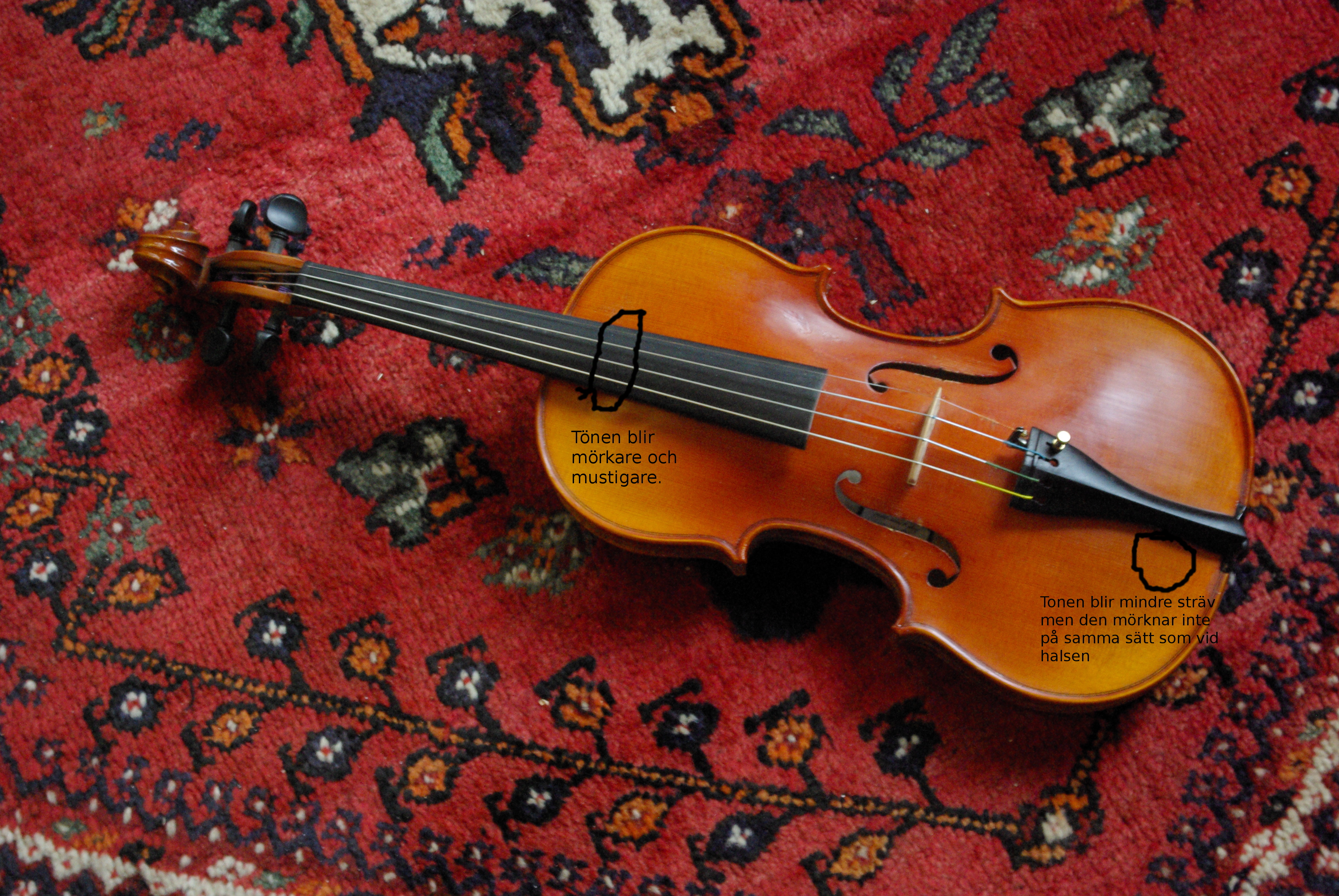 Då knacktonerna i A och E ligger nära varandra lönar det sig att kontrollera instrumentets stämning och spela en trudelutt. Spela samma melodislinga som använder alla strängar varje gång så lär du dig lättare att höra skillnader i tonfärg. En tjockbottnad fabriksfiol tenderar att vara rätt skrikig. Den justering du nu har gjort har gjort tonen betydligt mörkare och behagligare.