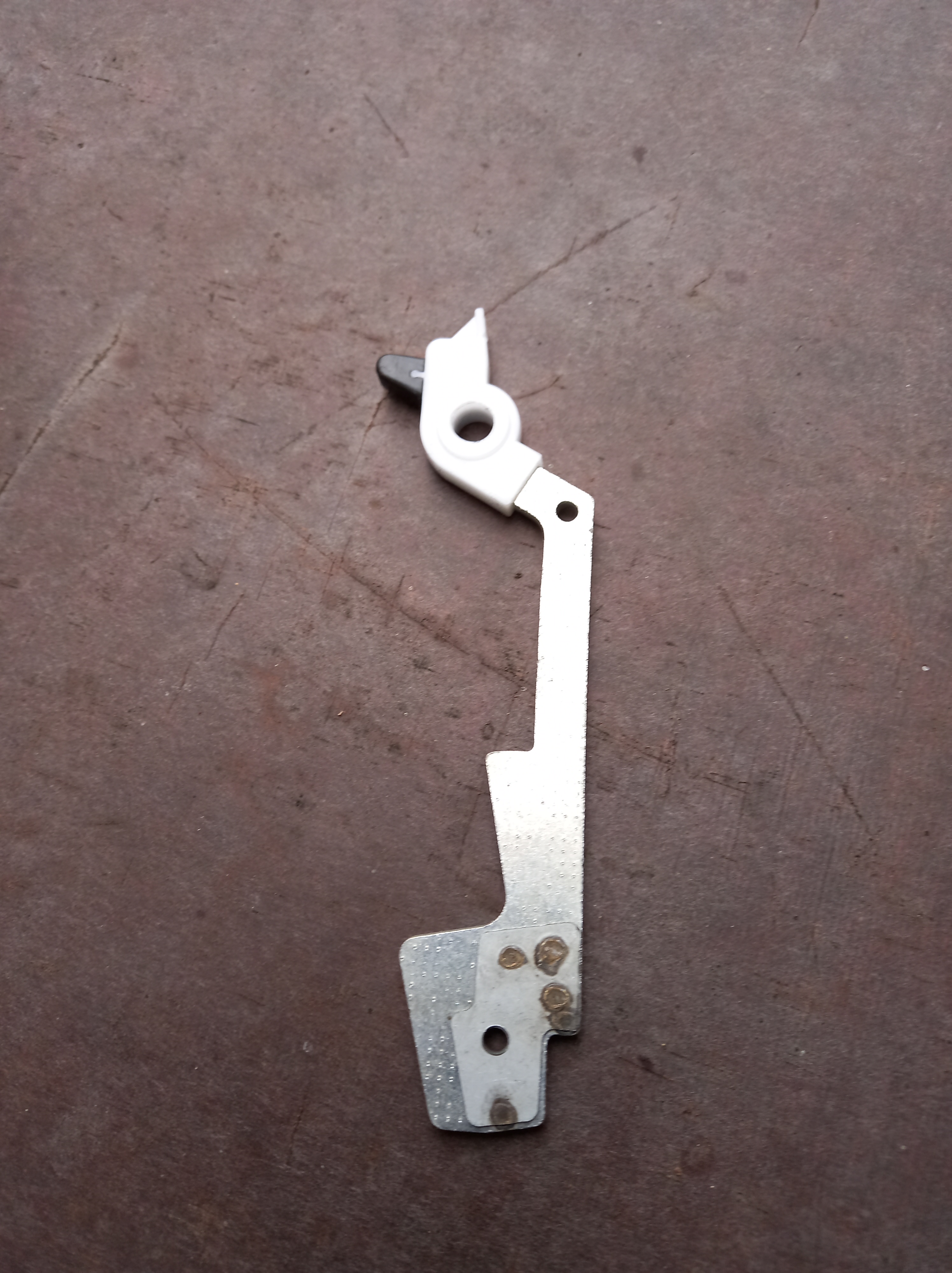 Fig. 7 En demonterad klubba. Problemet med kärvande klubba verkar vara att plasten med tiden sväller som en jäsande deg vilket ökar friktionen i hålet i den vita plastdelen överst. Då man jobbar med klubban kan det vara skäl att demontera den lilla triangelformade svarta plastdelen i närheten av axeln. Man kan mycket lätt tappa denna del och jag vet inte var man skulle hitta reservdelar. Lägg den åt sidan då du jobbar med tangenten. Jag tappade en av dessa svarta delar på golvet i den inte välstädade snickarboan men jag hittade den!