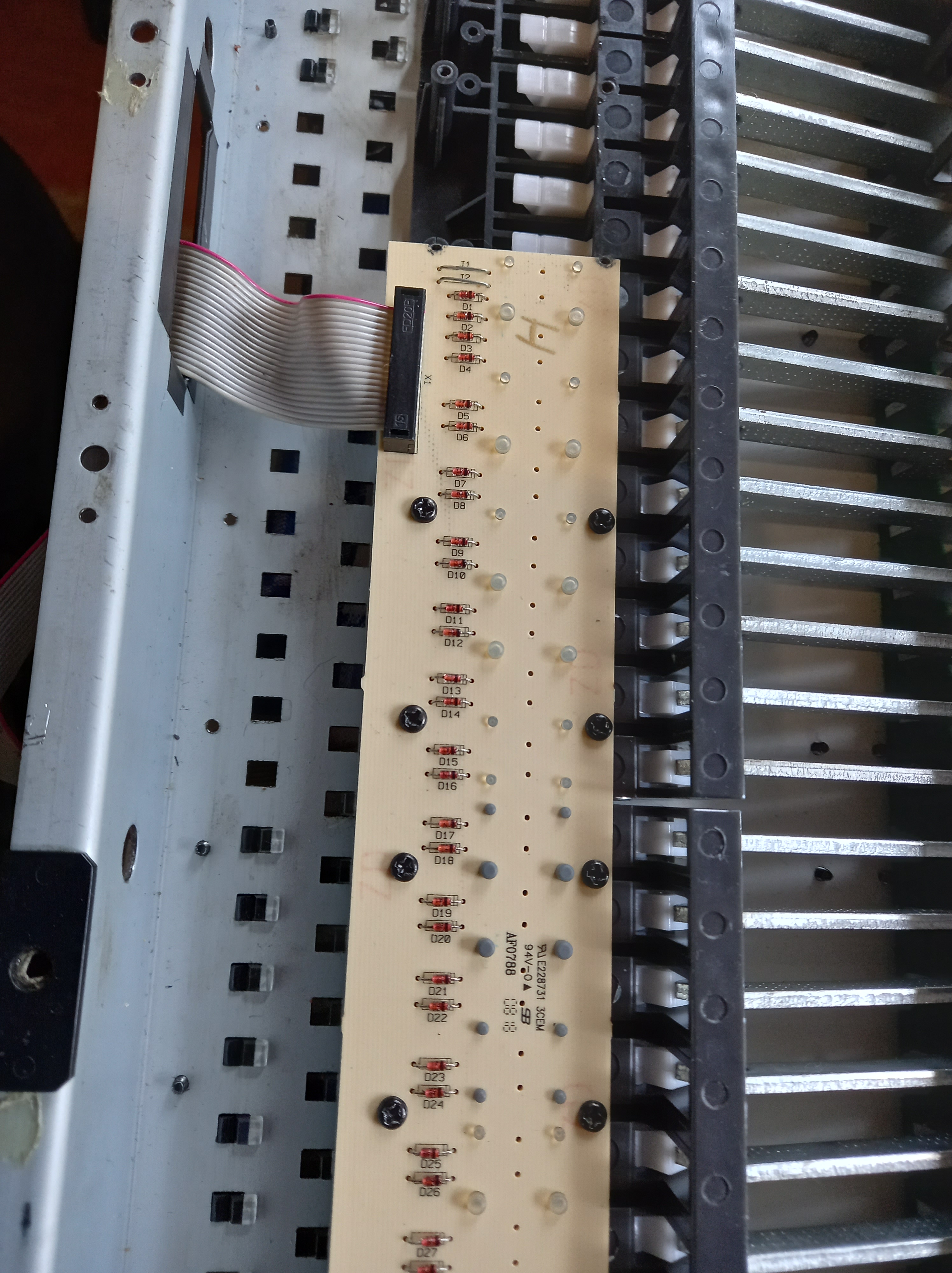 Fig. 5 Klubbornas moduler (en oktav) är skruvade till de två kretskorten. Det är inte möjligt att lossa en modul utan att lossa kretskorten. I bilden har det ena kretskortet redan demonterats. Längden på ett kretskort är halva längden av tangentbordet, det är alltså skäl att hantera kretskorten med försiktighet så att de inte skadas.