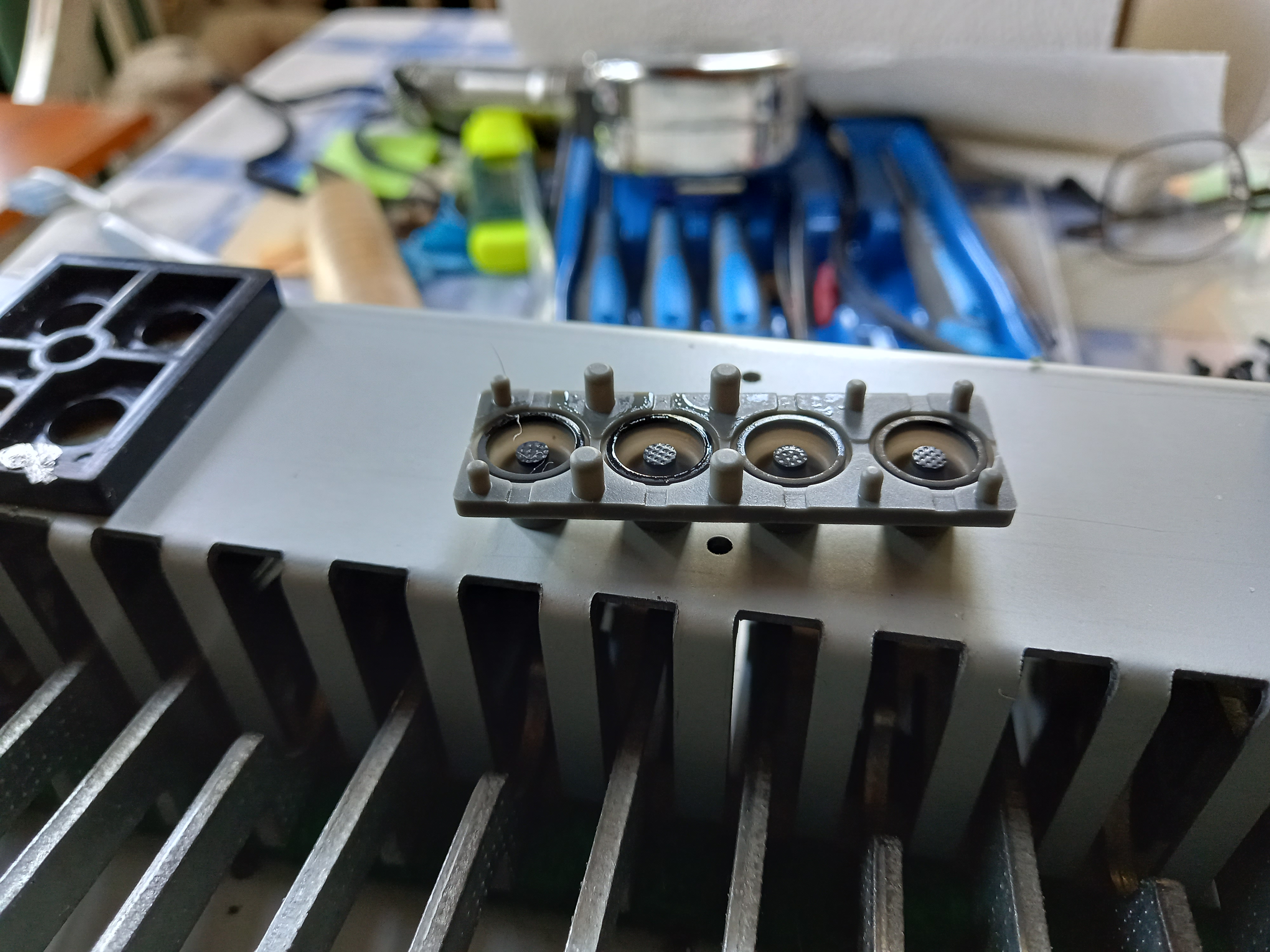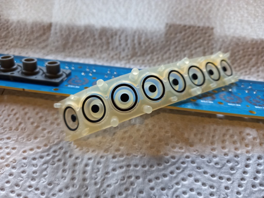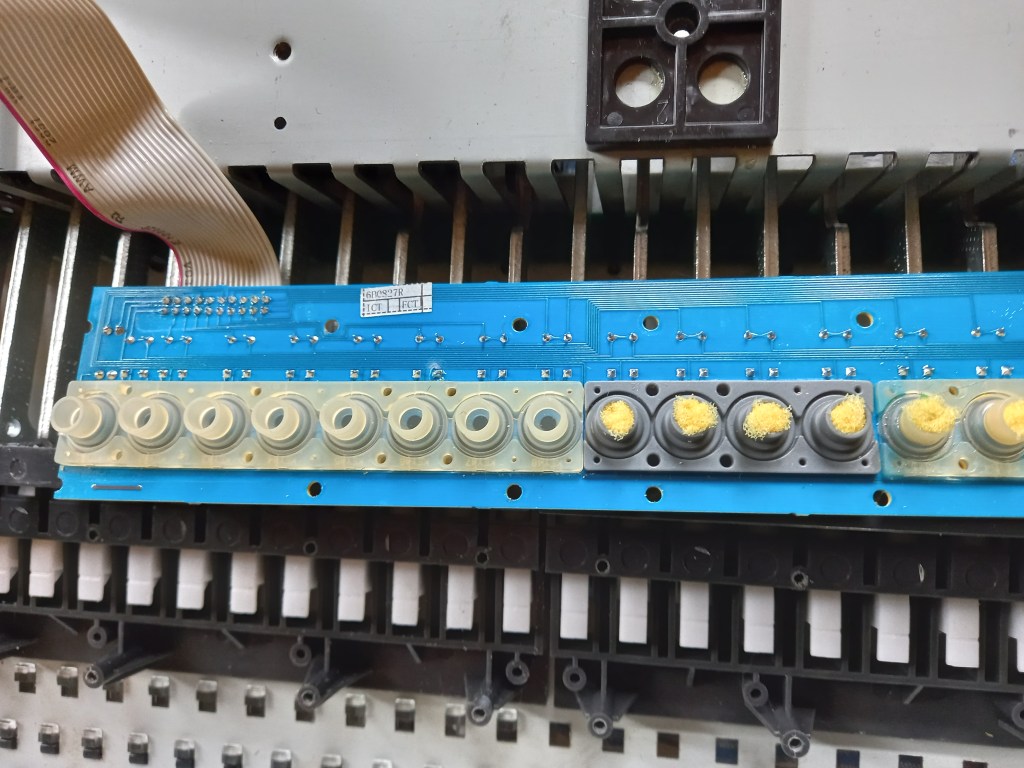 Det visade sig att Biltemas elektronikrengöring på sprayburk fungerade bra. Jag använde vaddstickor fuktade med rengöringsmedel för att putsa kretskortet. Jag tog helt loss sensordelen av gummi och sprutade rikligt av rengöringsämne vid kontaktytorna. I ett skede såg det lite skrämmande ut då rengöringsmedlet tydligen reagerade med gummit vilket fick som resultat att gummidelen rullade ihop sig som en mask. Då jag monterade tillbaka sensordelarna och satte ihop tangentbordet så visade det sig ingen tangent i den genomskinliga sensormodulen i bilden ovan fungerade … uups! Då jag provspelade några timmar senare så hade tvättmedlet avdunstat helt och tangenterna fungerade korrekt.