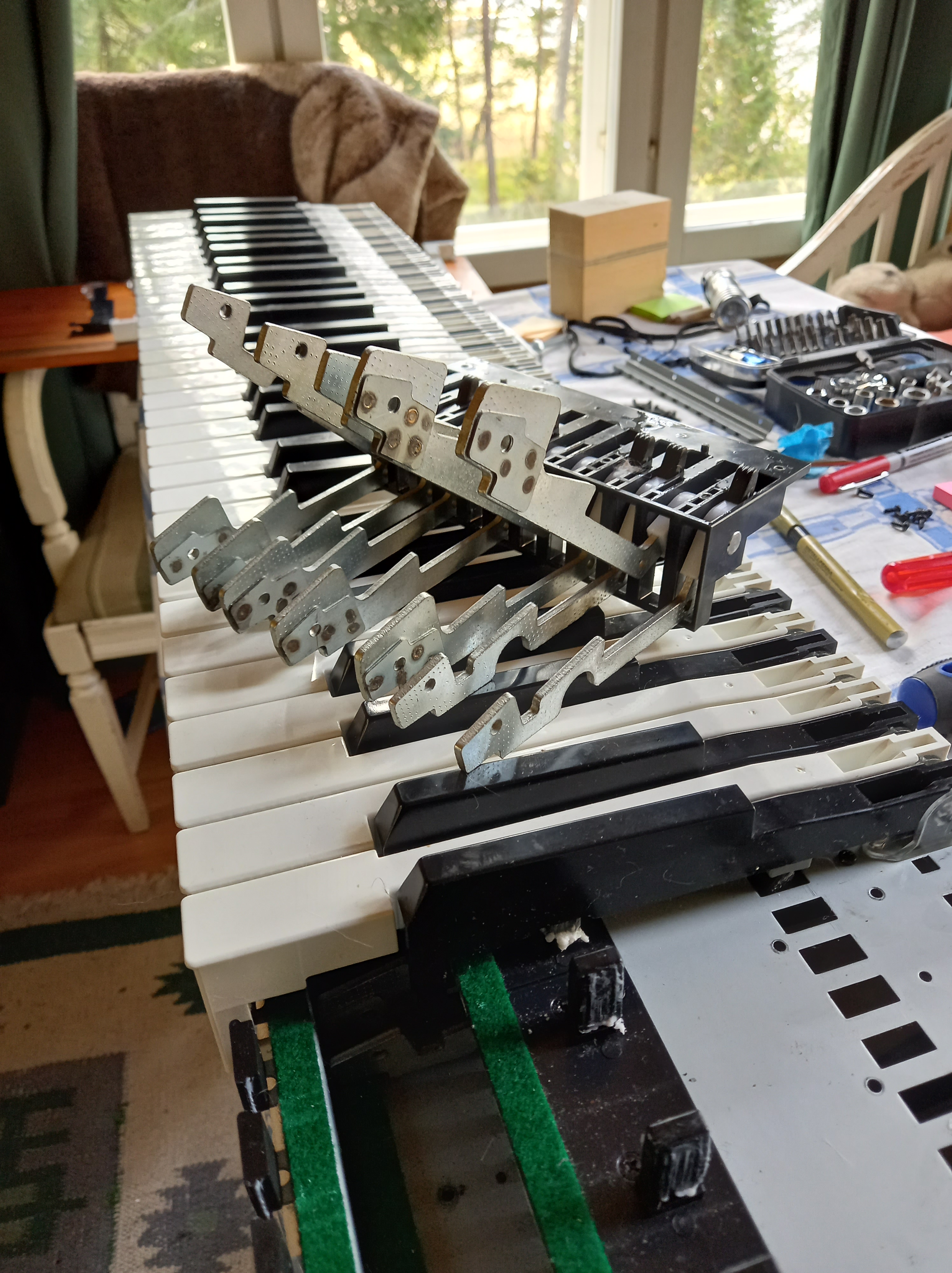 Ett jättetrevligt projekt som inte blev sämre av att jag på slutändan fick ett fullt fungerande instrument som jag annars sannolikt hade varit tvungen att betala 500-700 Euro för. Projektet visar också väldigt konkret att en fullständig genomgång av ett modernt elpiano inte är billigt. Då jag Googlade så hittade jag en prisuppskattning gällande service som gick på $500 vilket nog inte är något rövarpris för ett jobb som jag uppskattar att jag, om jag skulle göra om det, skulle kunna göra på en dag. Det stora jobbet var de kärvande tangenterna/hamrarna. Putsning av sensorerna krävde på slutet ungefär en halv timme mellan varven men innan allt fungerade så blev det några varv.