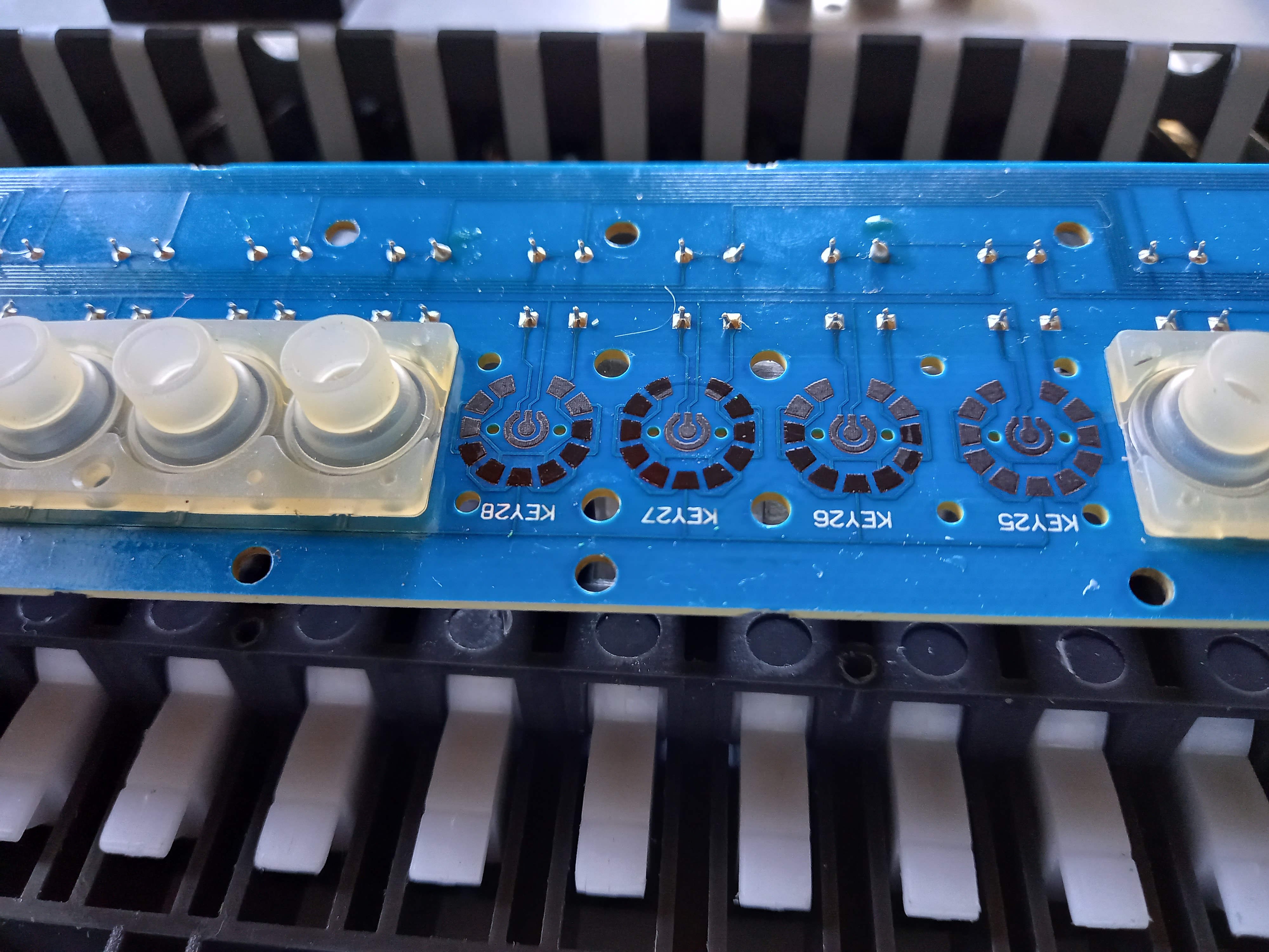 I fig. 7 har sensorkretskorten monterats loss och vi kan se undersidan och de runda kontakttornen som klubban slår mot. Varje runt torn består av två kontakter. Mitt i ett torn finns en liten rund kontakt kanske en mm från kretskortet. Runt basen på ett torn finns en kontakt som går runt tornet och som ligger mycket nära kretskortet. Då man trycker på sensorn så kommer tydligen ringelektroden först att göra kontakt och sedan centralelektroden. Som jag nämnde ovan så verkar standardkonstruktionen i andra elpianon vara en dubbelrad sensorer med en kontakt per torn.
